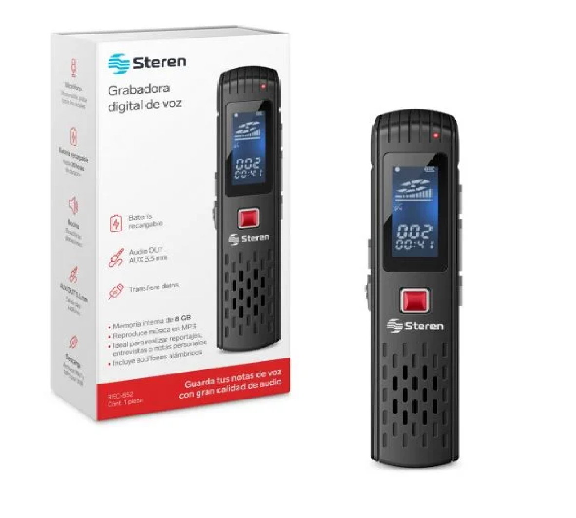Capacidad: Su memoria interna de 8 GB te dará hasta 46 horas de grabación con la máxima calidad (128 kbps) o más horas, si seleccionas la calidad mínima de 32 kbps.