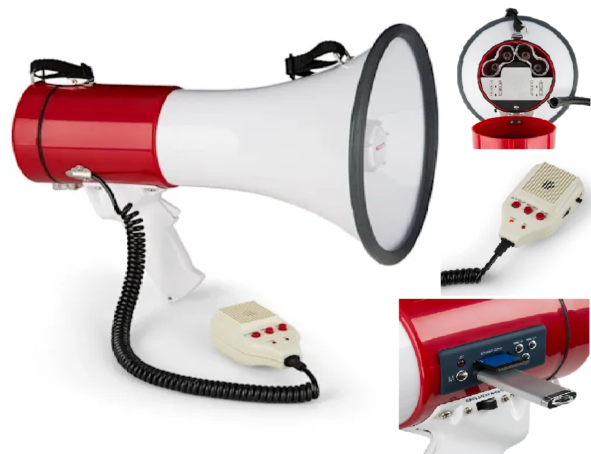 El megáfono 80W tiene un alcance de 700 m y ayuda a coordinar de manera efectiva grandes aglomeraciones de personas como, por ejemplo, una demostración o evento deportivo. Se puede dar el discurso hablando al dispositivo o reproducirlo a través de un reproductor de MP3 interno. Además, el megáfono dispone de funciones de sirena y silbido. Un cable en espiral entre el megáfono y la empuñadura proporciona una mayor flexibilidad y facilidad de uso.