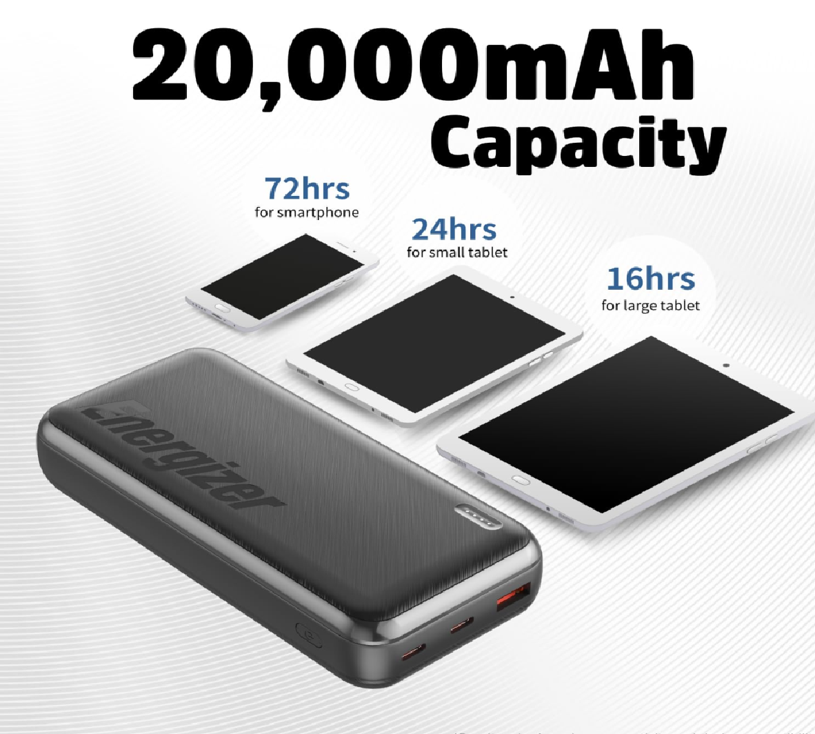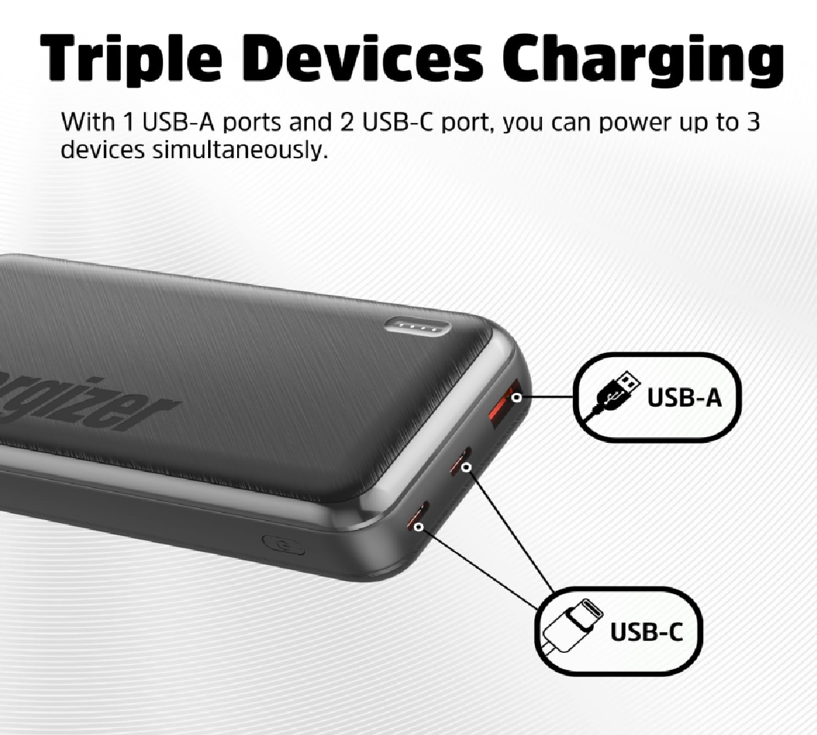 El cargador portátil Energizer UE20055PQ de 22.5 W está diseñado con salidas ultraaltas que ofrecen: