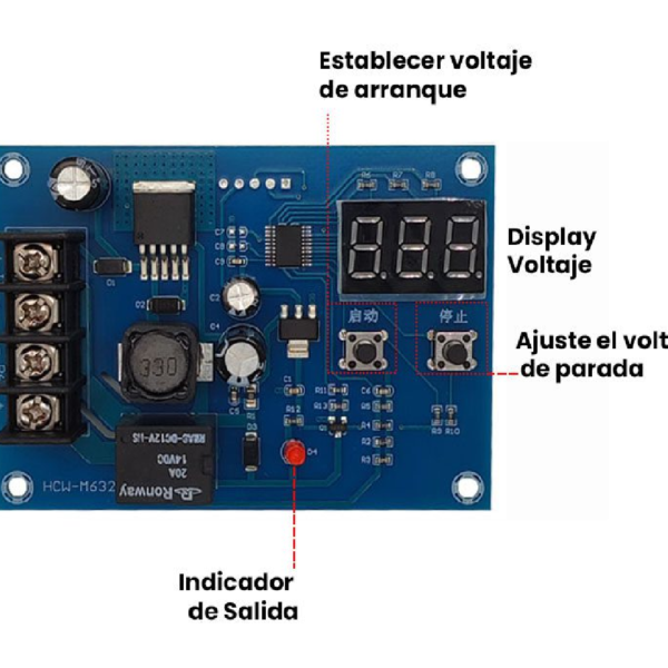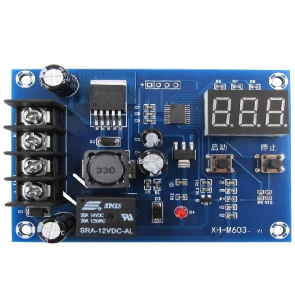 El Módulo XH-M603 Cargador de Baterías 12V 24V funciona como control de carga para baterías de litio, puede ser programado para comenzar la carga de voltaje y para finalizarla. Por ejemplo: Se configura como voltaje inicial 12V y 15V como voltaje de final, cuando el voltaje este por debajo de 12V el relé se cerrará permitiendo la carga de voltaje a la batería, cuando el voltaje alcance los 15V o sea mayor el relé se apagará deteniendo la carga.